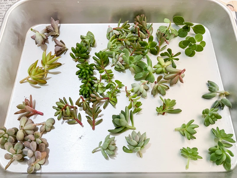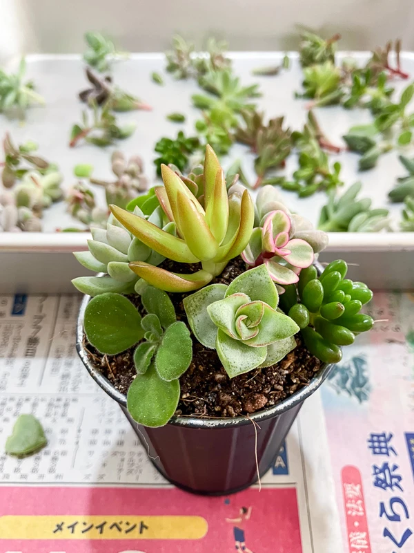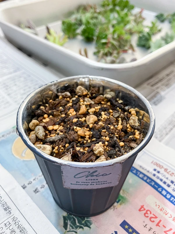 そこに、ヨーコさんのお庭からやってきた小さな多肉ちゃんたちを、ピンセットでちょんちょんと挿していくだけ。
