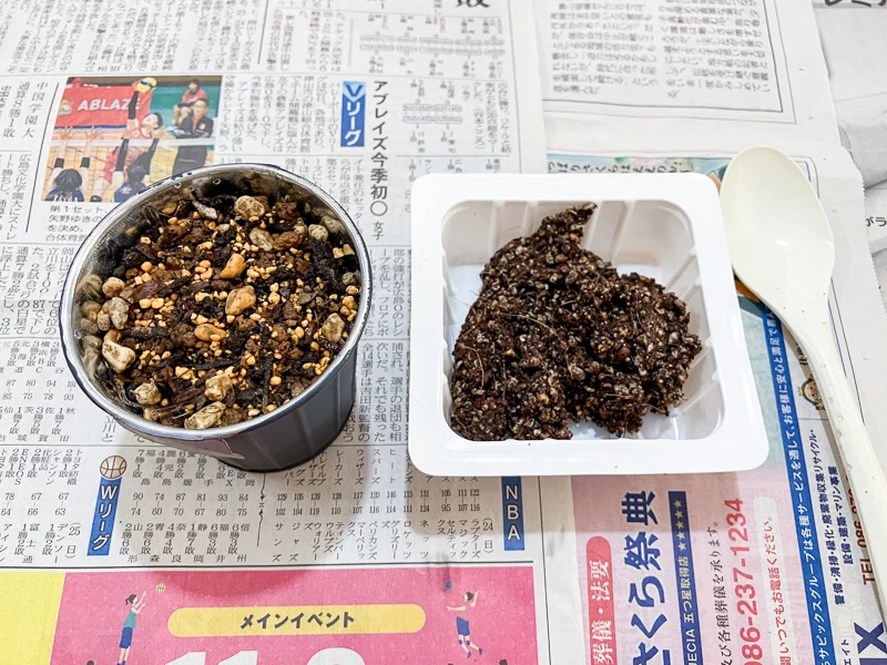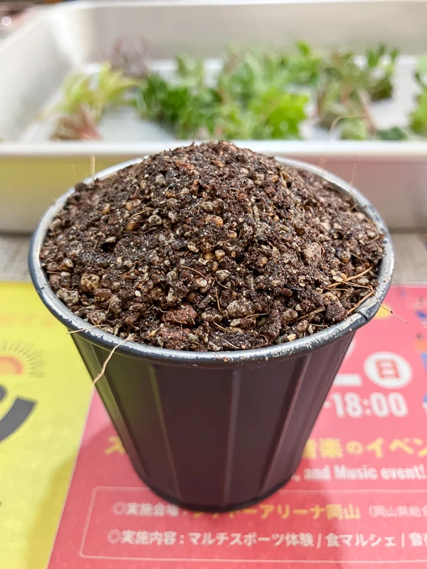 ヨーコさんから「底に穴がなくても大丈夫だから、小さめの入れ物を準備してね」と言われていたので、セリアで見つけたアンティーク調のポットを持参しました。