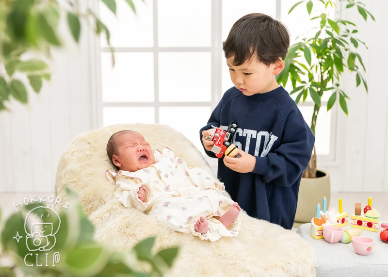 お兄ちゃんのアサヒくんは遊ぶのに夢中でしたが、泣いてるアカリちゃんをのぞき込んでくれたので、すかさずツーショット撮影📷✨